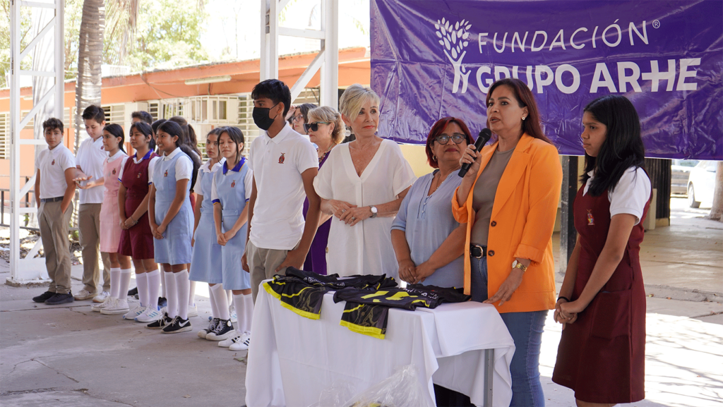 La entrega oficial de la nueva piel que estarán utilizando los estudiantes, se hizo en la cancha del plantel académico, encabezado por la directora de la secundaria, Minerva Razo Bojórquez, y Mónica Coppel Tirado, Gerente de Relaciones Públicas de Grupo ARHE, y Doris Camacho, directora de Fundación Grupo ARHE.